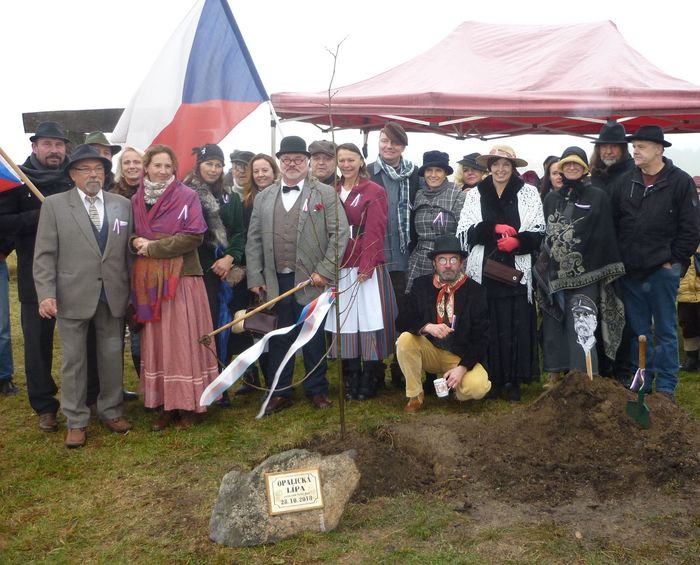 A právě sem byl zanesen a dále rozvíjen nápad, že na místě starého stromu by mohl stát strom nový. Volba padla na lípu a termín 28. říjen – sté výročí vzniku republiky se nabízel sám. Dál už se jen pilovalo. Uvaří se guláš, koupí se sud plzeňského, napeče se, připraví se trikolory, zapějí písně, zarecituje báseň, oblečou se dobové kostýmy a na koni přijede T.G.M. Na fotografiích můžete vidět, že až na počasí se vše vydařilo.